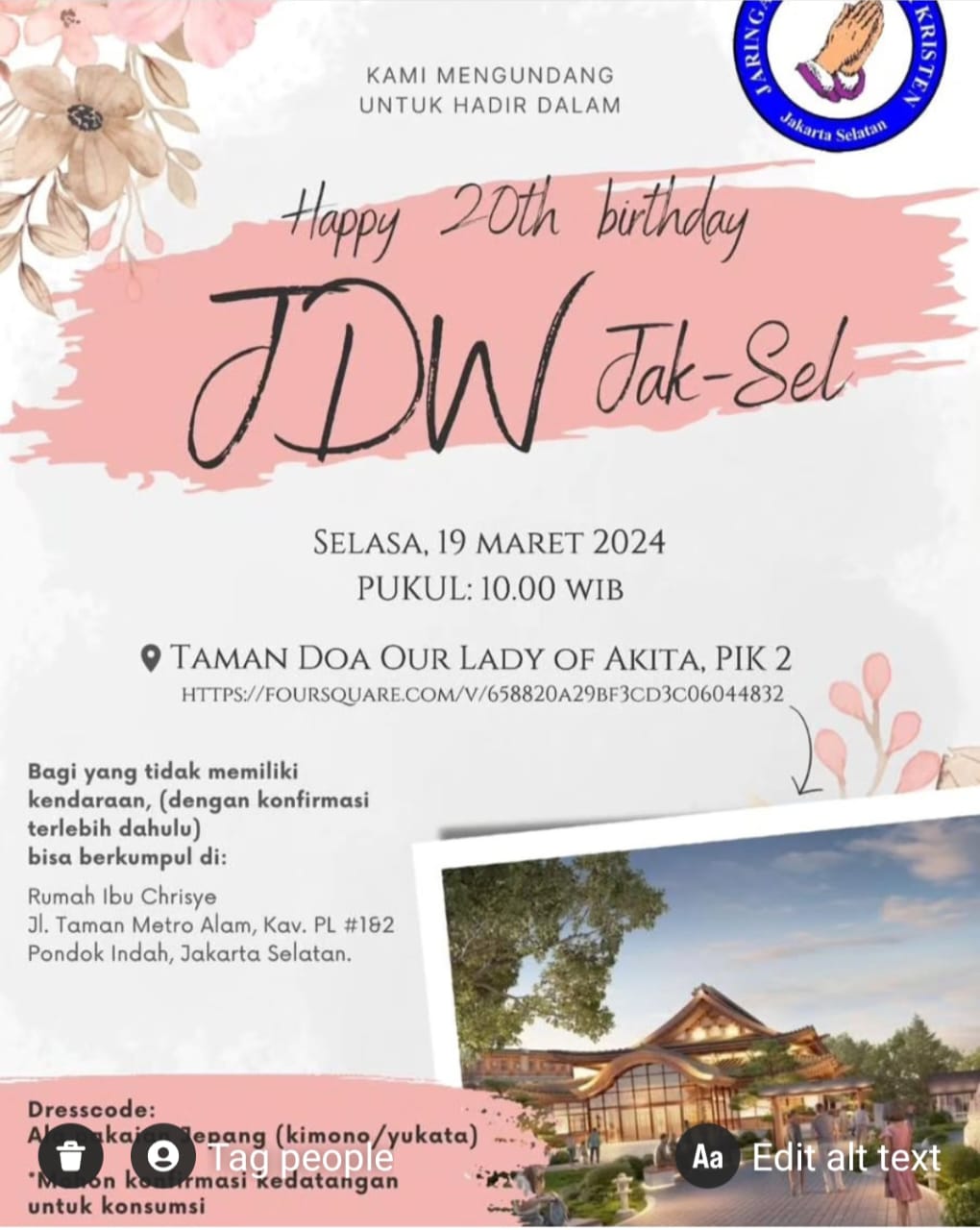Terimakasih tak terhingga kepada Tuhan YME, berkat perkenanNya JDW Jakarta Selatan dimampukan bertumbuh, berkembang hingga 20Thn. Halleluya 🙏😇