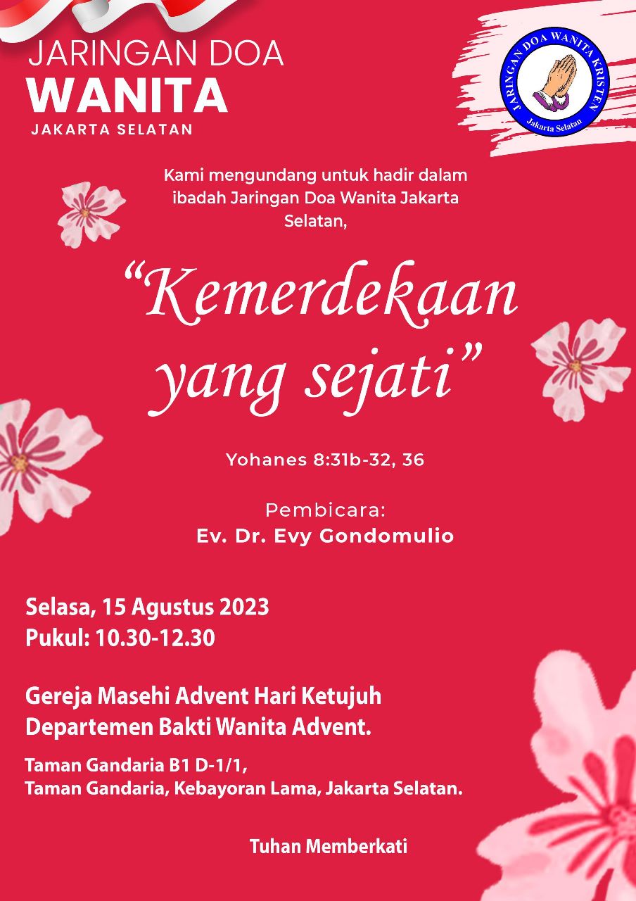 Jaringan Doa Wanita Katolik kembali telah mengadakan Ibadah Bersama dengan Tema “Kemerdekaan Yang Sejati” pada hari Selasa, 15 Agustus 2023 (Pk.10.30 s/d Pk.12.30) bertempat di Gereja Masehi Advent Hari ketujuh; Departement Bakti Wanita Advent, Gandaria-Jakarta Selatan dengan Pembicara Ev.Dr.Evi Gondomulia