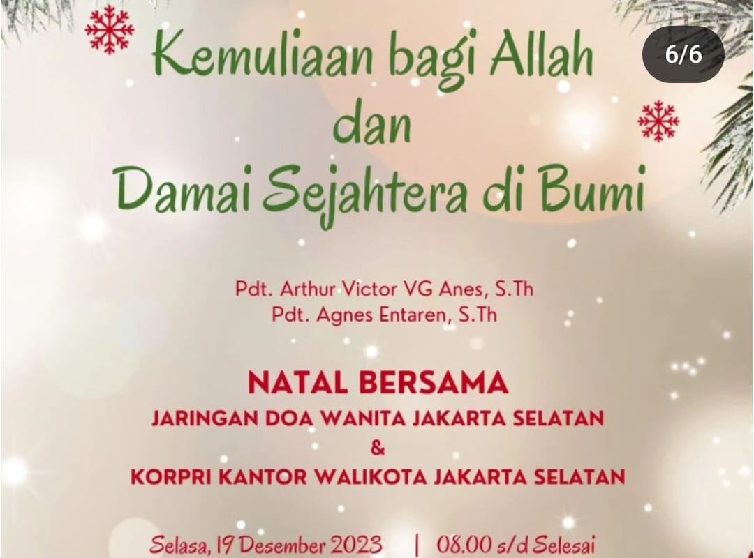 Jaringan Doa Jakarta Selatan dan Korpri Kantor Jakarta Selatan mengadakan Natal Bersama dengan Tema “Kemuliaan Bagi Allah dan Damai Sejahtera di Bumi” Bersama Pdt. Arthur Victor VG Anes, S. Th dan Pdt. Agnes Entaren, S. Th