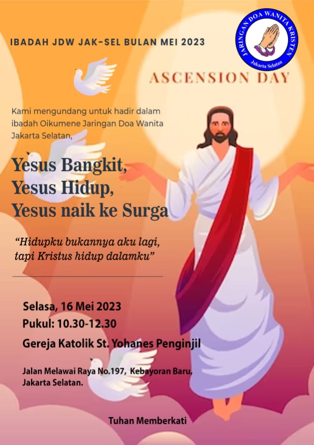 Pertemuan bulanan kali ini, Ibadah Jaringan Doa Wanita JakSel sekaligus memperingati Hari Kenaikan Isa Almasih dengan membawa Tema : Yesus Bangkit, Yesus Hidup, Yesus Naik Kesurga — “Hidupku bukannya aku lagi; tapi Kristus Hidup Dalamku”